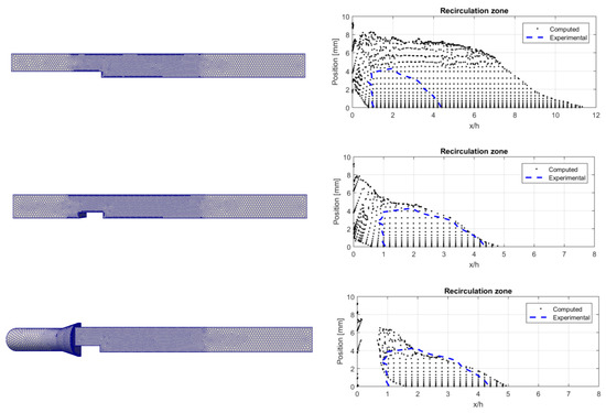 Backwards facing step mesh with increasing geometry detail (left) and the corresponding computed and experimental recirculation zones for pure water.