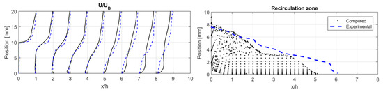 The computed recirculation zones are visualised by the data points where the streamwise velocity fulfils and the experimental zone is visualised by the level curve . In order for A, the sketch of the lines and the recirculation zone area are shown in Figure 4.