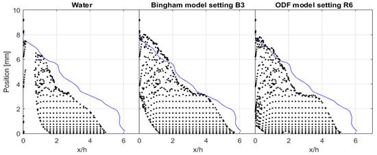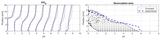 The best parameter settings for the respective models were identified by comparing the computed profiles and recirculation zones with the experimental ones. In Figure 5, the computed velocity profiles and recirculation zone is shown along with the corresponding experimental data with the best parameter setting for the ODF model and in Figure 6 for the Bingham model. The velocity profiles show the streamwise velocity normalised by the bulk velocity , hereby defined as the mean streamwise velocity at the step and at a height of .