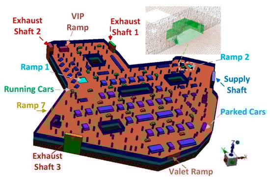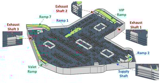 The investigated shopping mall has a total area equal to 150,000 m2 and is served by a multilevel underground carpark with a total capacity of 1477 car spaces as shown by Figure 1. The first level (P1) is located at the top and the nearest to the ground level where all parking cars have to go through it to enter or to exit the carpark. Cars need to use ramps to travel downward to the second level (P2) and the third level (P3) carpark while the fourth level (P4) was converted to a karting track and does not host parking spaces. However, P4 affects the ventilation system since all levels are connected to the same supply and exhaust shafts. All parking levels are similar in design with P1 having the least parking areas due to the existence of carpark entrances and exits within it. P1 with a height of 3.3 m and an air volume of 42,000 m3 was designed to accommodate up to 346 cars. P2, P3 and P4 with a height of 2.7 m and an air volume of 43,000 m3 and could accommodate up to 377 cars, each. P2, P3 and P4 have 2 ramps that connect each parking level to the one below it (Ramp 1) or the one above it (Ramp 2). Furthermore, there are three entrances/exits at P1 on South, West and North sides of the shopping mall. VIP entrance facing the North side, Valet entrance facing the South side and Ramp 7 entrance facing the West side.