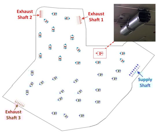 There are 136 impulse fans (Flaktwood, 31JT/3SP/RDD/TB), distributed over the four parking levels, used to circulate and mix the air flow from supply to exhaust shafts as shown by Figure 2. The 34 jet fans in each parking level push the air into three directions to ensure the mixing and the circulation of air from the supply to the three return louvers and to reduce the concentration of the exhaust gases in the stagnant air zones. When the impulse fans operate at low speeds, it has a flow rate of 600 L/s, and when at high speed it has a flow rate of 1200 L/s.