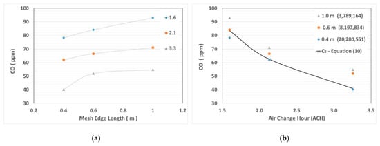 CO concentration as a function of: (a) Mesh edge length, (b) ACH.