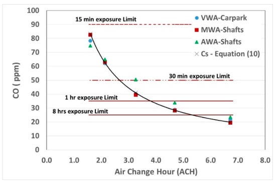 - The required ACH value should be estimated for each level within the carpark based on the running cars within the level to maintain the CO exposure limit within acceptable values. The carpark estimated value of 2.7 ACH was lower than the 3.4 ACH required for P1 with 28 running cars rather than the design value of 9 cars. Both values were much lower than the required 6 ACH as per international regulations.