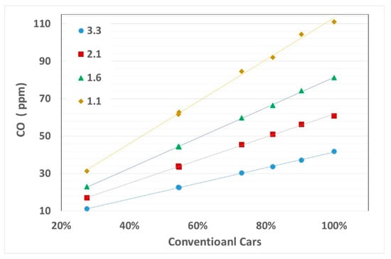 Effects of car fleet percentages on CO concentration at different ACH values.