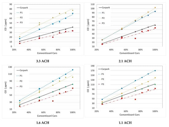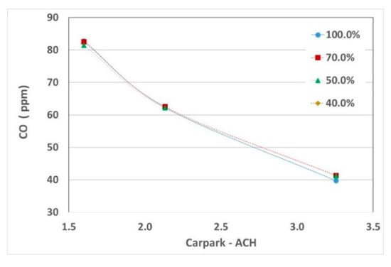 Based on Equation (10), the relation between CO concentration and the CO generation within the carpark at a constant supplied air flowrate is linear as confirmed by Figure 7. At 3.3 ACH, the ventilation system of the carpark was capable of maintaining the CO concentration below 50 ppm for all simulated cases. At 2.1 ACH, the ventilation system was good enough for a distribution of 81% of conventional cars or conventional cars occupancy percentage. The percentage was les for 1.6 ACH and 1.1 ACH where it reached 61% and 44%, respectively. In this way, a proper ventilation strategy could be build based on the occupancy rate of the carpark as a single unit. However, this is not the case when considering each parking level as an interdependent unit within the carpark as shown by Figure 8.