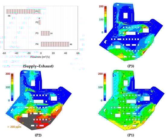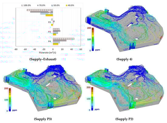 The behavior of the CO concentration within P1, P2 and P3 were different at different ACH value. Figure 8 shows that P3 had a healthy IAQ at 3.3 ACH for all the simulated cases whereas P1 and P2 were not. The main reason for that is the number of running cars at P3 were the lowest (9 cars) and the air supplied to it from the supply shaft or P4 through Ramps was fresh. The amount of air flowing from one level to another depended on the difference between the supplied an exhausted air through that level as shown by Figure 9. Figure 9 shows that P3 benefited from 46 m3/s of fresh air flew from P4 through the Ramps which made P3 a level with three supplied air inlets that lowered the CO concentration (Ccp) throughout the level well below the 200 ppm local limit. The number of cars in P2 was 12 running cars with 14 m3/s and 46 m3/s of contaminated air coming through the Ramps from P3, and P4, respectively. The amount of fresh air supplied to P2 was 3 m3/s less than the amount exhausted from the level which leaves around 56 m3/s of contaminated air to flow through the Ramps to P1. Although the average CO values for P2 were below 80 ppm at 100% emissions, the CO contaminated air of around 20 ppm came through the Ramps to P2 caused CO to reach unacceptable local levels (200 ppm) at the lower part of the carpark. Furthermore, this result has exposed the low air velocity at the lower side of P2 level which formed a stagnant air zone and highlighted the importance of running jet fans. The upper part of the carpark is closer to the supply louver than the lower part which caused most of the fresh air to flow towards exhaust shaft 1 causing a relatively low CO concentration. Based on Figure 8, P2 could meet the 50 ppm exposure limit when emissions/occupancy percentages were less than 60%. Similarly, P1 could meet the exposure limit at emissions of less than 75%. However, the IAQ of P1 exceeded the 90 ppm average value at emissions higher than 75% and 50% at 1.6 ACH, and 1.1 ACH, respectively.