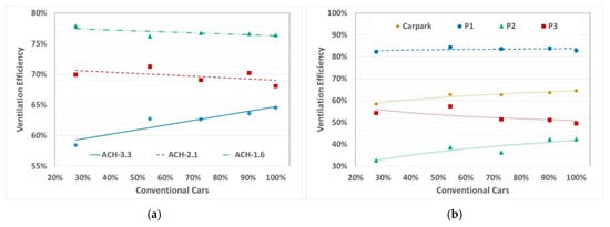 Ventilation efficiency within the carpark: (a) All carpark, (b) 3.3 ACH.
