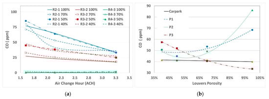 Effects of porosity on CO concentration within the carpark: (a) All carpark, (b) 3.3 ACH.