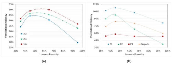 The parking levels showed different trends of the ventilation efficiency with P1 having the highest efficiency (84%), P2 the lowest efficiency (33–42%) and P3 around 52%. P1 has one supply louver, three Ramps openings, three exits and three exhaust louvers which are well distributed across the level. This enhanced the mixing effect within the level and increased the ventilation efficiency. P2 and P3 did not have exit openings and had three additional Ramps openings with short distances in between which enhanced air to flow between levels rather than across the same level. The location of one of the Ramps close to the supply louver caused fresh air to travel through all levels towards P1, which left the other levels with plenty of contaminated air and increased the CO concentration within the level that led to lowering the ventilation efficiency. The trend of the ventilation efficiency was similar to the carpark trend as it presented the average value of the total carpark values.