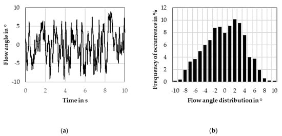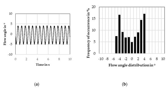 (a) Flow angle time history for a sine signal ( = 1.5 Hz, = 4.4°); (b) Flow angle probability distribution for the same signal.