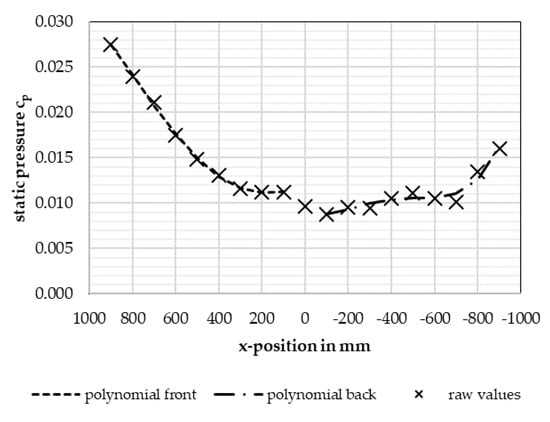 To measure the static pressure distribution in x-direction, a Prandtl probe was placed in the empty test section at y = 0 and z = 150 mm. For every signal, the probe was moved along the x-axis from x = 900 mm (close to the nozzle) to x = −900 mm (close to the collector) in 100 mm steps. At each measurement point, the pressure measurement was averaged over 30 s. The measured static pressure function over the x-position was then smoothed by using a fourth-order polynomial for both the front and back of the curve. Figure 6 shows an example of this process: