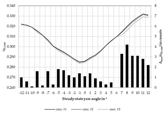 As mentioned in Section 3.3, each data point was measured three times with different wind tunnel configurations, then corrected three separate times. Ideally, the three resulting corrected values should be identical. To reiterate the validity of the correction method for steady-state measurements, the different corrected values of the DrivAer notchback’s steady-state yaw sweep is presented in Figure 9. The yaw sweep was measured with mounted, but stationary, flaps, with the yaw angle created by rotating the turntable.