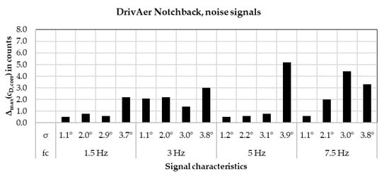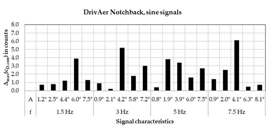 As expected, the aerodynamic drag increases with increasing flow angles ( or ). Interestingly, the measured drag does not seem to correlate with the signal’s frequency content at all. For both the noise and sine signals, the drag values stay in a corridor of roughly 3 counts for the same signal standard deviation or amplitude.
