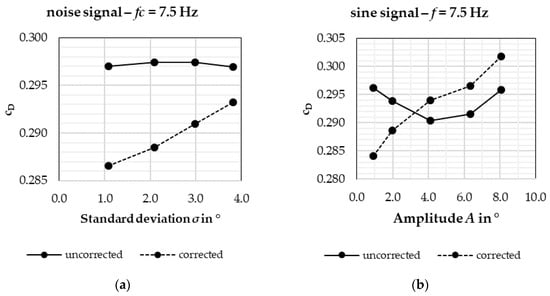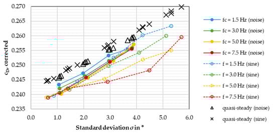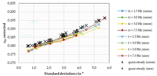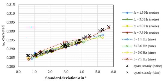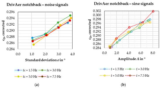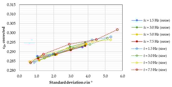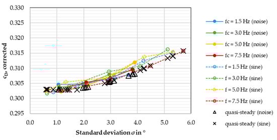 The biggest deviation, however, results for the SAE squareback. As Figure 18 shows, the values measured for the sine signals differ significantly for the same standard deviation, at = 3° and above. There seems to be a clear correlation between frequency and drag for the sine signals—the bigger the frequency, the smaller the drag. Furthermore, the quasi-steady values are always 2–3 counts higher than all unsteady drag values. These results prove that the signal frequency does affect the aerodynamic drag, not for all, but for some vehicles. Still, were the sine signal datasets to be removed, the remaining values measured with the noise signals would still fall in a narrow corridor of roughly 4 drag counts for the same . Despite the sine signals acting differently here compared to the other vehicles, the cutoff frequency of the noise signal still has no bearing on the vehicle’s aerodynamic drag.