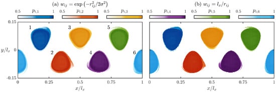 Spectral clustering membership probabilities for clusters identifying materially coherent vortices, with fuzziness and number of clusters (incoherent cluster probabilities are omitted). The similarity functions used are (a) the proposed Gaussian similarity measure (3) with , and (b) the inverse measure from [15] sparsifying values less than 1/0.075. The six color maps presented here are also used in Figure 2, Figures 4a,b, and 7.