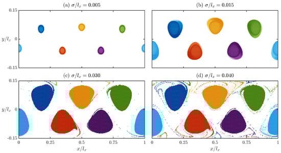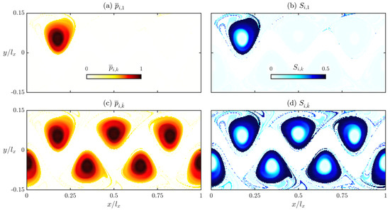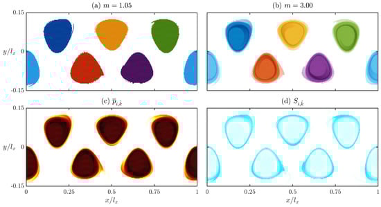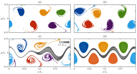 Figure 7 presents the membership probabilities for four realizations with variable and . While the realizations do modify the position, shape, and dynamics of the vortices (see videos in Supplementary Materials), their presence and number, as well as the presence of the shear jet, mostly remain unchanged. Figure 7a,b presents how variable the initial cluster sizes and shapes can be, as well as the effect of the wave phases on the nonuniform spacing between the identified vortices at . While for most realizations all six vortices are identified, there are cases where some of the expected vortices are not identified. Figure 7c presents a case in which the jet is identified and one of the vortices is missed. For that case, vortex 5 gets identified as part of the chaotic sea (not plotted), while a highly asymmetric jet is identified as another coherent cluster in the system, and trajectories are assigned membership probabilities . Figure 7d presents a case for which a more symmetric jet is identified as a cluster and two of the vortices (2 and 4) are merged into a single cluster. Other realizations, not illustrated here, result in cases where only a few (or even none) of the vortices are identified. For those realizations, there is no clear Eulerian signature of the six vortices. In what follows, only clusters that identify one and only one vortex are considered for statistical purposes.