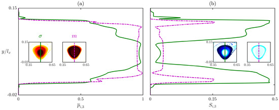 Membership probability profiles for (a) mean and (b) standard deviation corresponding to vortex , for the variable- (solid green line) and variable-m (dash-dotted magenta line) studies. Insets present the clustering statistics for vortex 3, from Figure 3c,d and Figure 4c,d. The profiles correspond to the cross-section and are interpolated from the membership probabilities at , presented in the insets. Corresponding colorbars presented in Figure 3.