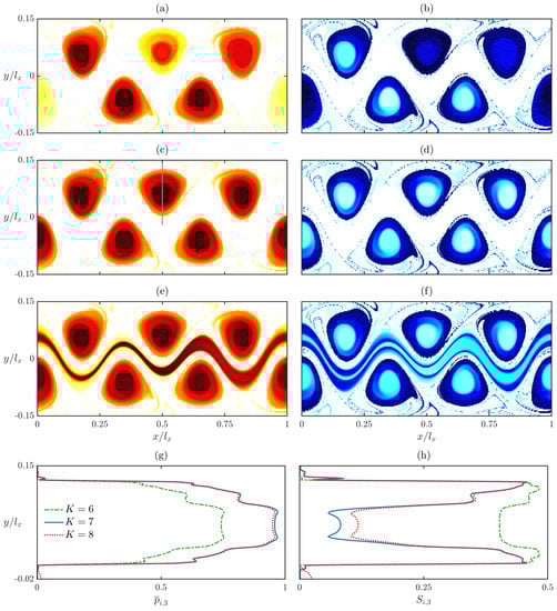 Clustering statistics varying and m, for different numbers of clusters K, with sampled from a uniform distribution over . Each row for (a–f) presents the superimposed mean (left) and the corresponding superimposed standard deviation (right), for (a,b) , (c,d) , and (e,f) . Membership probability profiles corresponding to the cross-section (solid gray line in (c)) are interpolated at and presented for (g) mean and (h) standard deviation corresponding to vortex , for variable K. Corresponding colorbars presented in Figure 3.