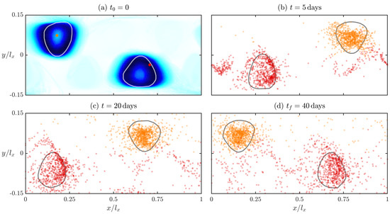 To illustrate the ramifications of regions of high uncertainty, we demonstrate how different ensemble trajectories are when initialized at high and low uncertainty locations. At , the orange particles in Figure 9a are initially located at the core of cluster 1 and correspond to and , while the red particles start at the perimeter of cluster 4 and correspond to and . Figure 9b–d presents snapshots of the particle positions for all 1000 realizations at three different times. For reference, the gray boundaries enclose vortices and 4 for the central realization (for particles such that ). While particles released in the position of lowest uncertainty (orange) remain concentrated, particles released in the position of highest uncertainty (red) quickly spread throughout the domain. The presence of the jet separating the top and bottom of the domain keeps most orange and red particles from moving to the opposite half. Particle concentration is more pronounced for the case of lower uncertainty, with 76.4% of the particles remaining inside the corresponding boundary after days, as opposed to only 45.0% for the higher uncertainty case. This corresponds well to the dispersion statistics of the final particle positions, where the dispersion length is the standard deviation of the final position for the different realizations. This length is 0.38 for the particles released inside the vortex core (orange) and 2.48 for the particles released in the high uncertainty zone (red). Note that the periodicity has been disregarded in this calculation. The six fold increase in the dispersion length is characteristic of particles released in the chaotic sea and the high uncertainty regions. Within the vortex cores, the dispersion is consistently low because the trajectories remain close due to being stuck within the vortex that is highlighted by the clustering results.