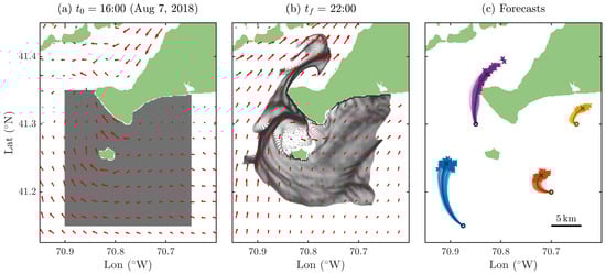 We used the MIT Multidisciplinary Simulation, Estimation, and Assimilation Systems primitive equation (MSEAS-PE) ocean modeling system [39,40] to compute ocean surface velocity forecasts in the Martha’s Vineyard coastal region during August 2018. The modeling system provided forecasts of the ocean state variable fields (three-dimensional velocity, temperature, salinity, and sea-surface height) every hour, with a spatial resolution of 200 m. More details about the model forecast initialization, tidal forcing, atmospheric flux forcing, and CTD data assimilation can be found in [25,36]. The deterministic two-way nesting ocean forecast initialized from the estimated ocean state conditions at a particular time is referred to as the central forecast, and ensemble forecasts were initialized using Error Subspace Statistical Estimation procedures [43]. The forecasts within the ensemble were initialized from perturbed initial conditions of all state variables and forced by perturbed tidal forcing, atmospheric forcing fluxes and lateral boundary conditions. These perturbations were created to represent the expected uncertainties in each of these quantities. Finally, parameter uncertainties (bottom drag, mixing coefficients, etc.) were also modeled by perturbing the values of parameters for each forecast.