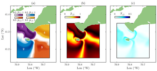 Figure 12a–d presents the mean cluster trajectories for each of the 4 clusters, on which we superpose the drifter positions from [36]. To plot the evolution of , the entire domain is first split into bins. Then, at each time instance, an average membership probability for each bin, over the forecasts, is calculated. This average is based on particles inside each bin at time t, and weighted by their membership probabilities . The overall system dynamics are similar to what was observed for the central forecast in Figure 10a,b, with the clusters highlighting groups of different behavior. Using the labels from Figure 11a, while cluster 1 (purple) travels a longer distance to the northeast, ending north of Martha’s Vineyard, cluster 2 (blue) moves a shorter distance northward, while clusters 3 and 4 (red and yellow) are less dynamic and remain mostly to the east of Nomans Land.