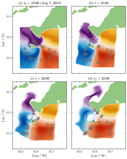 Time evolution of the average clusters in a binned domain. The 18 drifters are marker-coded depending on the cluster in which they started. Crosses represent the 4 drifters initialized at locations of higher uncertainty, with . The times correspond to (a) 16:00, (b) 18:00, (c) 20:00, and (d) 22:00 UTC. Triangles are initialized on the purple cluster (3 drifters), squares on the blue cluster (5 drifters), and circles on the orange cluster (6 drifters). Corresponding colorbars presented in Figure 11a. (See Supplementary Materials for a video of the time evolution.)