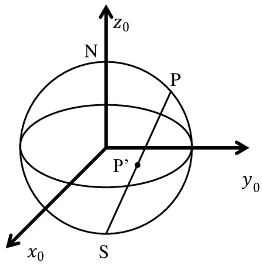 Stereographic projection: the point P of coordinates on the sphere is projected on P’ of coordinates on the plane. N and S denote respectively the north and south poles. (Reproduced with permission from [24]).