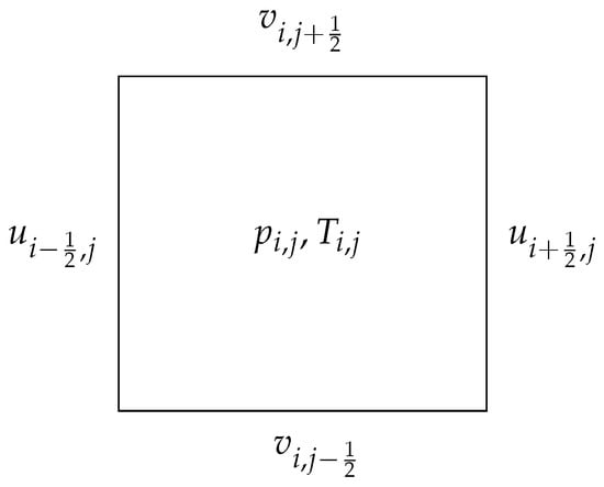 Description of numerical spatial cell: the velocity components are computed in the middle of the cell borders whereas the pressure and the temperature are computed at the center of the cell. (Reproduced with permission from [24]).