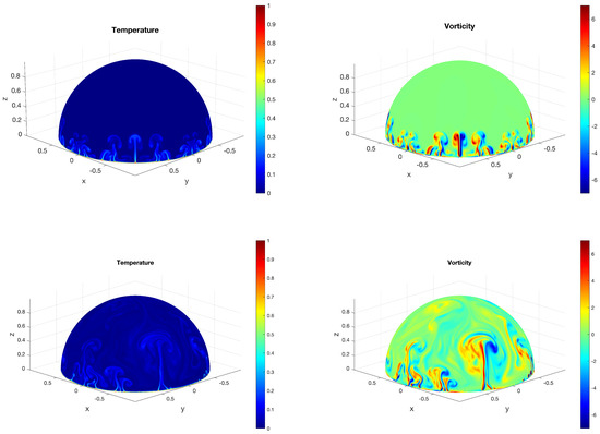 As shown in Figure 2, the discrete values of the velocity field are located at the middle of the cell sides and the discrete values of the pressure p and the temperature T are located at the center of each cell. A Murman-like scheme is used for the approximation of the convection terms. This kind of scheme has been fully described in [27]. A time splitting has been used to first solve the temperature equation and then the coupled pressure and velocity equations since the temperature equation can be solved separately. A parallel process by Message Passing Interface (MPI) is used to solve both of them. A linear system of equations , where A is a pentadiagonal matrix, T is the temperature vector and E the explicit part of the discretized temperature equation is obtained by the discretization of the temperature equation. The matrix A being not a self-adjoint matrix anymore in our present curved surface problem, we have to solve this linear problem using a biconjugated gradient method. The discretization of the coupled velocity-pressure system of equations leads to solving a discrete linear system where represents the discrete operator, is the discrete equivalent of the right hand side of (8) and is the approximate solution we are looking for. All the numerical results presented in the following have been obtained with , on a grid. A grid convergence analysis in order to verify that the grid is dense enough to describe a turbulent flow had been carried out in [24]. We had computed the global temperature on the bubble for different sizes of the grid and for a given Rayleigh number. The results obtained with the grids and for various values of the Rayleigh number, and various values of the rotation rates, were almost exactly the same, whereas the results obtained with coarser grids ( and ) were slightly different. As shown in [24], a fine grid () would be better to describe the boundary layer at the equator, but would not modify the global behavior of the fluid in the bubble. The grid has thus been chosen in the present study for performing the various numerical simulations. Different values for the parameters and have been tested in [24] to stabilize the computations. The bubble can be stabilized with and which are the values used in the numerical simulations. Examples, in the non-rotating case, for the temperature and the vorticity fields are given in Figure 3 for two different times: at the beginning of the simulation (top) and in the stationary state (bottom). We can observe in Figure 3 thermal plumes emerging at the base of the bubble. The experiment is similar to a long two-dimensional toric Bénard cell in the beginning of our simulation: the cold fluid is heated from below, and the plumes are convected upward. In the beginning, there is no interaction between the plumes and the center of the domain remains empty. We can also observe these small thermal structures emerging from the heated equator on the vorticity field. The plumes continue to grow over time and start to interact with each other. As can be observed in Figure 3, the small structures along the equator are now giving birth to vortices that move along the bubble surface. A stationary state can be achieved and the results presented in the sequel have been obtained in this regime of the numerical experiments.