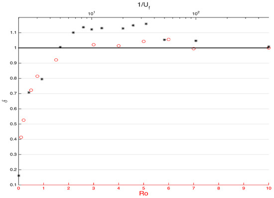 Even if our setup is completely different we can make a parallel with two new studies about 3D rotating Rayleigh–Bénard Convection. Rajaei et al. [31] recently published new results about the rotation dominated regime in rapidly rotating Rayleigh–Bénard convection. They found that the transition to the rotation dominated regime coincides with the suppression of vertical motions, the strong penetration of vortical plumes into the bulk and a reduced interaction of vortical plumes with their surroundings. In Alards et al. [32], the authors study in detail, with a Lagrangian approach, the transition from the rotation-unaffected regime, where the heat transfer is constant, to the rotation-affected regime, where the heat is enhanced. They found a sharp transition in the horizontal acceleration statistics near the top plane at a Rossby number lower () than the one typically found for the transition between rotation-unaffected/affected regimes (). According to their study, the steepening of the velocity gradients at the boundary and the generation of swirling convective flows in the boundary layers are two partially separate processes: heat transfer enhancement at and generation of vertically aligned vortex tubes at . They also observe a crossing between the thermal and the Ekman layers for a Rossby number equal to whereas the maximum of the Nusselt enhancement is located for between and .