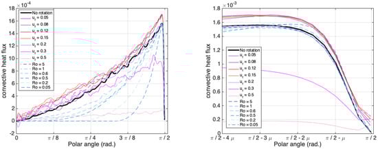 The convective heat flux, created by the buoyant forces, corresponds to the transport of heat by the movement of the fluid from hot areas (at the equator) to cold ones (north pole). In classical Rayleigh–Bénard experiments, the structures responsible for the convective heat flux are called “plumes” [13,30] and are usually characterized by a strong correlation between the temperature fluctuations (where denotes the overall time and space average) and the vertical velocity. In our numerical simulations, the vertical velocity is replaced by the radial component (pointing to the north pole) of the velocity, and the convective heat flux is then defined by where l denotes the latitude in radians. This mathematical object precisely measures the heat that is moved upward from the equator to the north pole. We obtain with our convective heat flux the same kind of information as the plumes counting described by Pieri et al. (see Figures 5 and 6 in [13]). Our results for various values of the Rossby number (Method 1) and of the velocity boundary condition (Method 2) are summarized in Figure 5.
