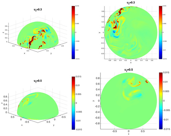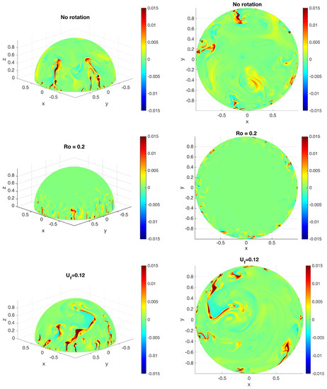We can also visualize the plumes responsible for the convective heat flux in the convective heat fields for various values of the parameters and . In Figure 6, mushroom-shaped plumes can be observed in the non-rotating case. Short and medium sized plumes are present all around the bubble. The effects of rotation through Method 1 for can be observed in Figure 6. The long plumes have completely been suppressed and only the short plumes are present very close to the equator. Most of the surface of the bubble is now completely free of structures. In the case of Method 2, moderate velocity rotations increase the length of the plumes as can be observed in Figure 6. However, for high velocity rotations (top Figure 7), long plume structures are still present but are very localized in a small part of the bubble. For very high rotations (bottom Figure 7), very few and very localized structures can be observed almost reaching the north pole. This is a completely different phenomenon from what we can observe with a very small Rossby number in Method 1. With Method 1, the long plumes are suppressed but short plumes are still present all over the bubble. With Method 2, however, short plumes are absent and a few, localized, and weak heat structures succeed in detaching from the equator to escape to the north pole. This is a clear observation of the intermittent character of the dynamics induced by the rotations created by Method 2.