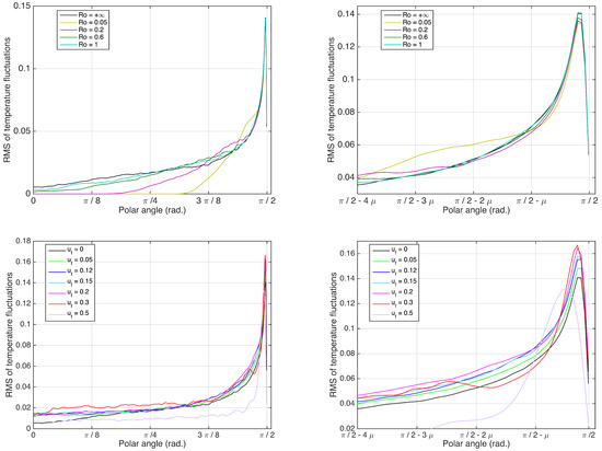 Temperature fluctuations RMS. Top: Method 1 for various values of the Rossby number. Bottom: Method 2 for various values of the forcing . Right: Zoom around the equator; .