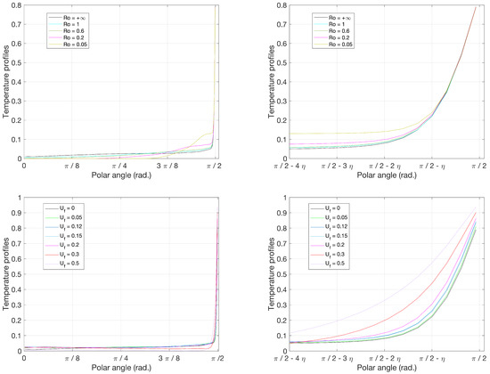 Temperature profiles. Top: Method 1 for various values of the Rossby number. Bottom: Method 2 for various values of the forcing . Right: Zoom around the equator; .