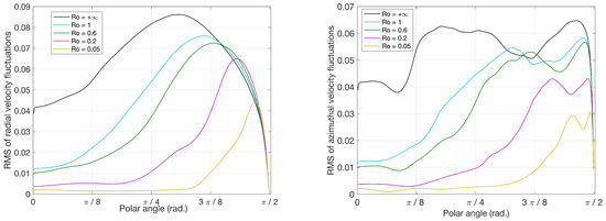 Method 1. Left: Radial velocity component fluctuations RMS for various values of the Rossby number . Right: Azimuthal velocity component fluctuations RMS for various values of the Rossby number .
