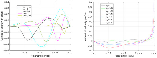 Azimuthal velocity profiles. Left: Method 1 for various values of the Rossby number ; Right: Method 2 for various values of .