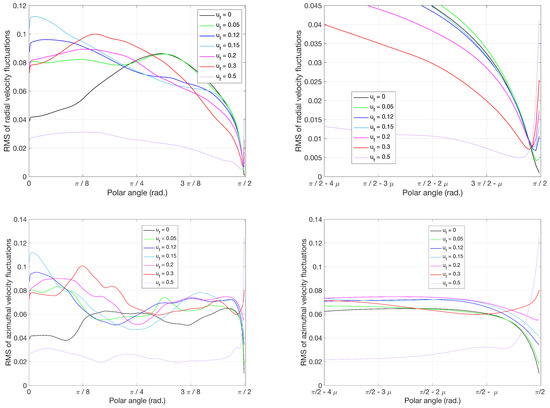 Velocity fluctuations RMS for various values of (method 2). Top: Radial velocity component. Bottom: Azimuthal velocity component. Right: Zoom close to the equator; .