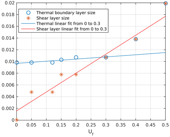 Thermal boundary and shear layers sizes (polar angle in radians) for various values of the velocity forcing .