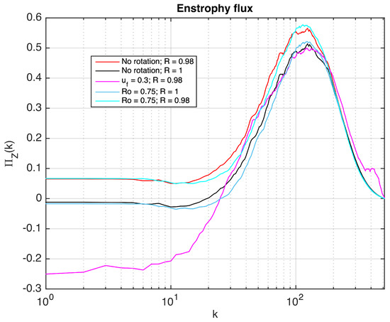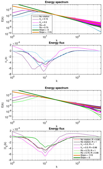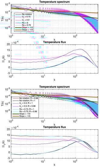 Energy, enstrophy and temperature spectra and fluxes are given in three separate Figure 14, Figure 15 and Figure 16 for relatively strong ( and ), moderate ( and ) and no rotations. The values for relatively strong rotations are those leading to 80% of the initial (without rotation) Nusselt number, and the values for moderate rotations are those leading to the highest enhancement of the Nusselt number.
