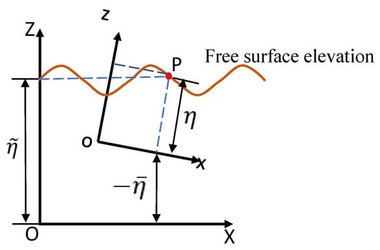 In addition, with the application of the body-fixed reference frame, the total free-surface elevation observed in the body-fixed coordinate system can be decomposed into two components for the convenience of numerical implementation: directly solved from time-domain BVPs and due to the unsteady wave frequency motions of the body. The sketch of the free-surface elevation is presented in Figure 2 and the total free-surface elevation can be expressed as