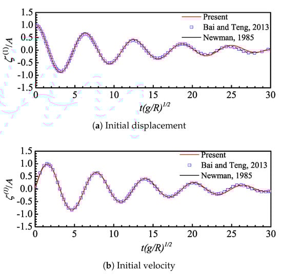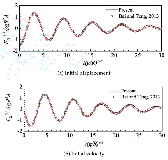 Figure 5 shows good agreements of vertical displacement in comparison with the analytical solution given by Newman [45] and numerical results by Bai and Teng [32]. It can be observed that the vertical motion of the cylinder gradually damps out with time. This can be attributed to the conversion of energy from body motion to the radiation waves propagating outwards from the body. This phenomenon can also be seen in the time process of the vertical hydrodynamic force on the cylinder in Figure 6. Furthermore, a phase lag of hydrodynamic force relative to the corresponding vertical motion can be found in each studied case, comparing results in Figure 5a and Figure 6a, Figure 5b and Figure 6b, respectively, which can be explained by the harmonic characteristics of the body motions.