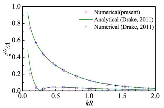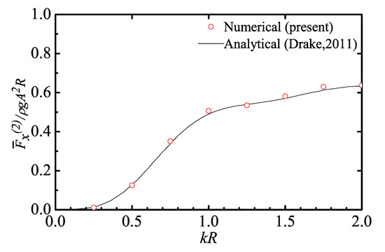 Figure 7 shows the normalized lateral displacement at still waterline and the base, with fairly good agreement with the analytical solution and a frequency-domain numerical result, both digitalized from Drake [46]. The horizontal mean-drift force on the spar platform is presented in Figure 8 for different , where k denotes the wavenumber. The present numerical results agree reasonably well with the analytical solution by Drake [46].