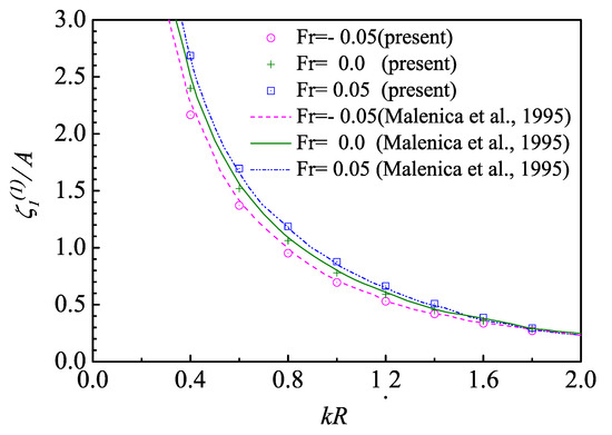 The problem of a vertical cylinder subjected to incident wave and moving with a constant forward speed is studied to verify the accuracy and robustness of the present model with small forward speed or current. The 1st-order problem is solved in the time domain following the numerical procedure presented in the previous sections. The cylinder has a radius R. The draft and water depth are both equal to R. The cylinder is free to move only in the surge direction. Two typical Froude numbers for and are considered, where the Froude number is defined as , with U the forward speed of the structure.