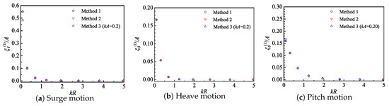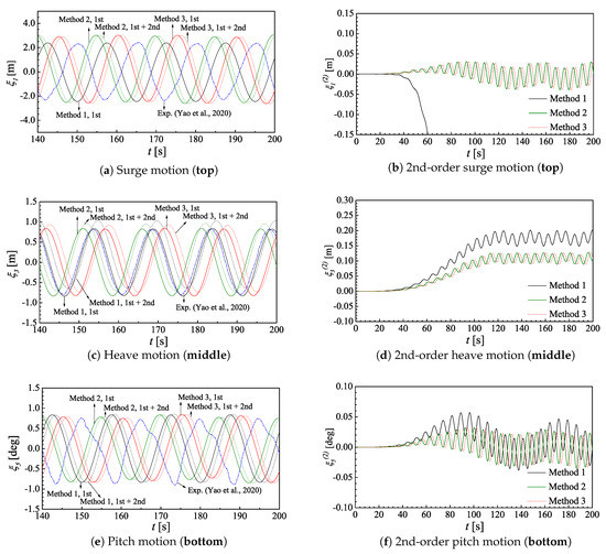 The surge, heave, and pitch motion results are presented in Figure 14. The figures on the left are the 1st-order or total results in comparison with experimental measurements. The corresponding 2nd-order components of the numerical results are presented in the figures in the right column. In the figures, the results for the three cases are denoted by ‘Method 1’, ‘Method 2’, and ‘Method 3’, respectively. To make better comparisons, we have shifted the linear numerical results for Method 2 and Method 3 by a phase angle of relative to that of Method 1. For the same reason, the 2nd-order results have also been shifted by for those two cases.