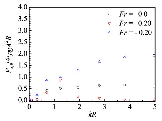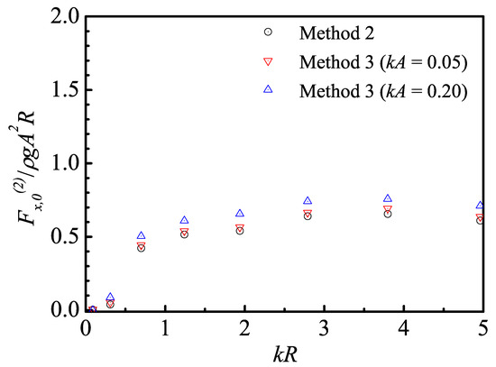 The non-dimensional mean-drift force are compared in Figure 16, where results for Method 2 and Method 3 with and are included. The 3rd-order terms in Equations (27) and (28) are included in the calculation of the mean-drift forces. Since the mean-drift force is normalized by , the non-dimensional total mean-drift forces are dependent on . For small wave steepness , the results are very close to that of Method 2 (no viscous drag at all), while clear increases of mean-drift force are seen for due to the viscous-drag contribution.