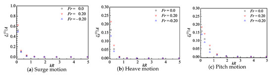 The 1st-order motion RAOs of the 6MW spar-type FOWT at different Froude numbers. Note that the problem of a body undergoing a positive forward speed in waves is equivalent to the problem of a body in waves and negative current by neglecting the interaction between the wave and current.