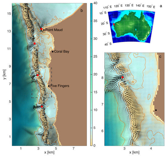 As for most wave-dominated reef systems where the circulation is bathymetrically controlled, the dominant wave-driven flow patterns within Coral Bay were relatively insensitive to the offshore wave conditions (i.e., changing wave heights increased the strength of the flows but did not significantly change the flow directions). In addition, the dominant shelf circulation offshore of the reef tends to be southward, associated with the Leeuwin Current [14]. In this study, by default we thus focus on a typical incident significant wave height (Hs = 2 m) and southward alongshore current (0.1 m s−1) at a 10 m depth on the reef slope. We also conducted additional sensitivity simulations (similar to those reported in [10]) to assess the influence of the varying incident wave conditions and alongshore current on the inner shelf. Two simulations were performed with a default southward offshore current and with significant wave heights of Hs = 1 and 3 m. Two additional simulations were performed using the default Hs = 2 m, but with the offshore current being either turned off or northward.