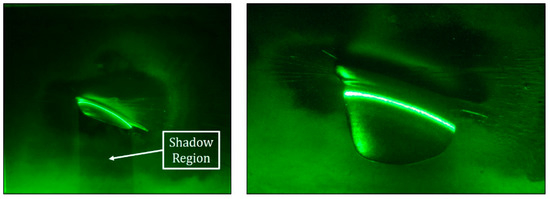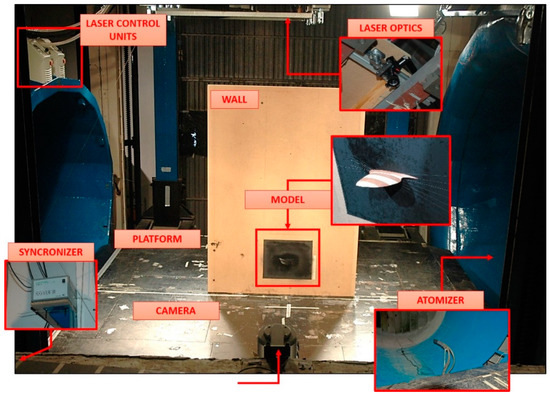Flow illumination was provided by two pulsed Nd:YAG 190 mJ lasers with a 8 ns of pulse duration. Images were taken using a Power View Plus 4MP camera with a 2048 pixels × 2048 pixels resolution that was placed outside the air stream at a distance to the test section of 1.5 m. Via a 64-bit camera link, data transmission directly to the PC RAM was allowed with an information transfer up to 512 MB per second, which is sufficient for the information budget considered in this study. The camera lenses were AF Nikkor 80–200 mm f/2.8 D IF-ED. The flow in the wind tunnel was seeded using two Laskin atomizers, which provided olive oil droplets having a diameter of 1 µm, which is small enough to follow the flow. Synchronization between image capturing and flow illumination and the analysis was carried out using the TSI Insight 3G software and the TSI Laser Pulse Synchronizer Model 610,035. The size of the interrogation window was 240 mm × 240 mm, which lead to a pixel size of 117 µm, which is small enough to follow the phenomena being analysed. Each recording sequence consisted of 200 pairs of frames separated from each other 0.06 s, corresponding to 15Hz and lasting for a total of 13.3 s. The time between pulses was 25 µs, which means that a particle moving at 10 m/s would move only 0.25 mm. Each PIV area was divided into smaller sub-interrogation areas containing 32 pixels × 32 pixels, which corresponded to a geometrical area of the size 3.7 mm × 3.7 mm, and during the post-processing an overlapping of 50% was employed. Due to the intersection of the laser plane (that illuminates from the top) with the model, there is a shadow region below the model for Sections S2 and S3 (see Figure 7).