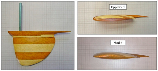 Due to its symmetry, only half-models were tested and the method of images was employed. Two half-models were made up of wood as 1:2 scaled versions of both airfoils (see Figure 3 again). Figure 4 shows the top and side views of the two models. The mean aerodynamic chord was 9.35 cm, while the area of the half-model was 0.011 m2. The models were attached to the wall (see Figure 1) by means of a screw that allows selecting the angle of attack. The model was placed at 30 mm height respect to the floor of the platform, in order to neglect ground effects. The model and its surroundings were painted in black to avoid light reflections.