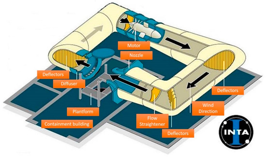 The INTA Low Speed Wind Tunnel 1 is a closed-circuit open-section wind tunnel. A sketch of the wind tunnel configuration is observed in Figure 5. The test section is a 3 m × 2 m elliptic section. The nozzle contraction ratio is 5:1. The motor power (DC 450 kW, 420 V) allows velocities up to 60 m/s. The wind stream velocity was 10 m/s, which led to a Reynold number of 6.4 × 104. The turbulence intensity of the wind tunnel at the velocity of the experiment (10 m/s) was 0.9%.